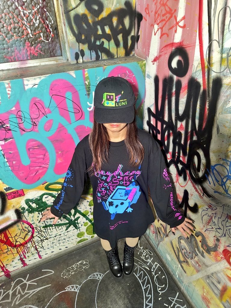 ブラックライト対応の高発色ラバープリントが映える、コットン100%・5.6 oz・リブ袖仕様のロンTです。