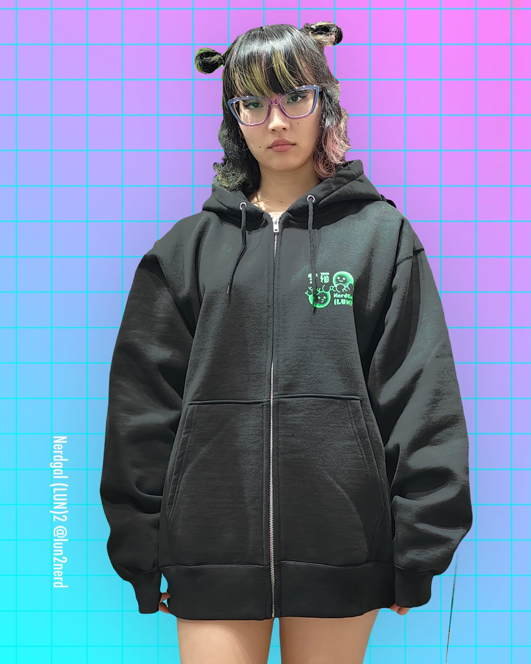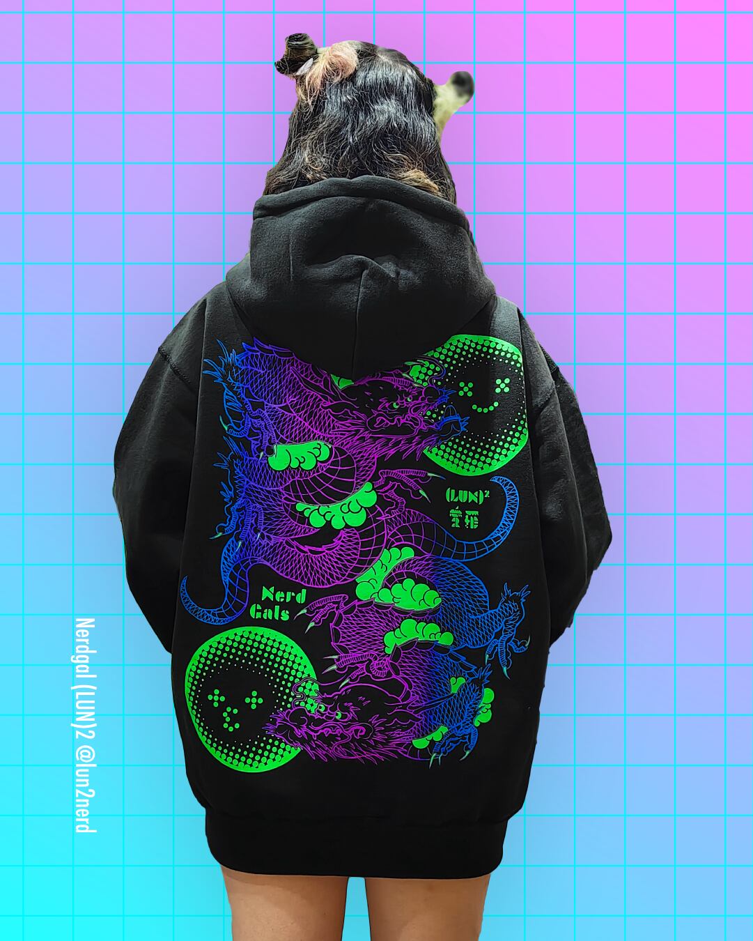 “青龍”のモチーフを、彫り師・愛羅が表情豊かに描き下ろし、るんるんがサイバーに仕上げました。手描きの“揺らぎ”とデジタルでしか描けない“正円”を組み合わせた、サイバー×刺青の融合グラフィックをパーカーに落とし込みました。