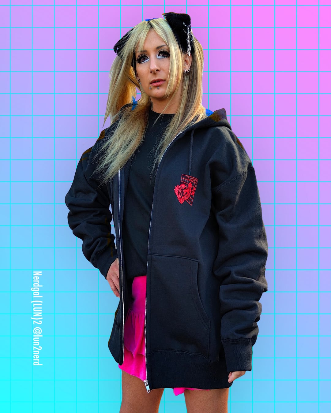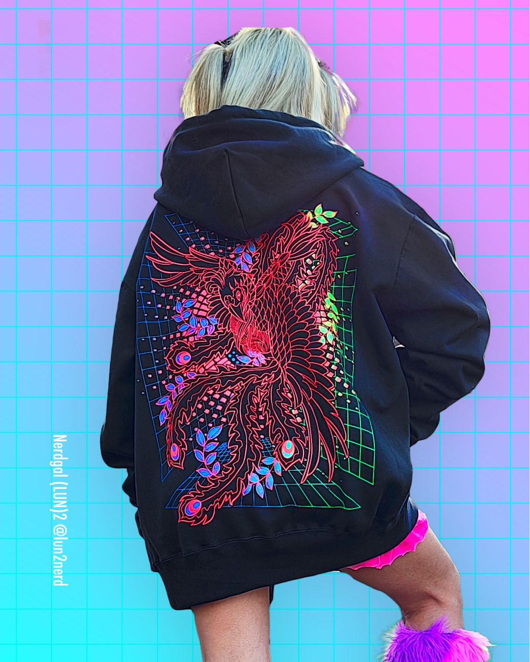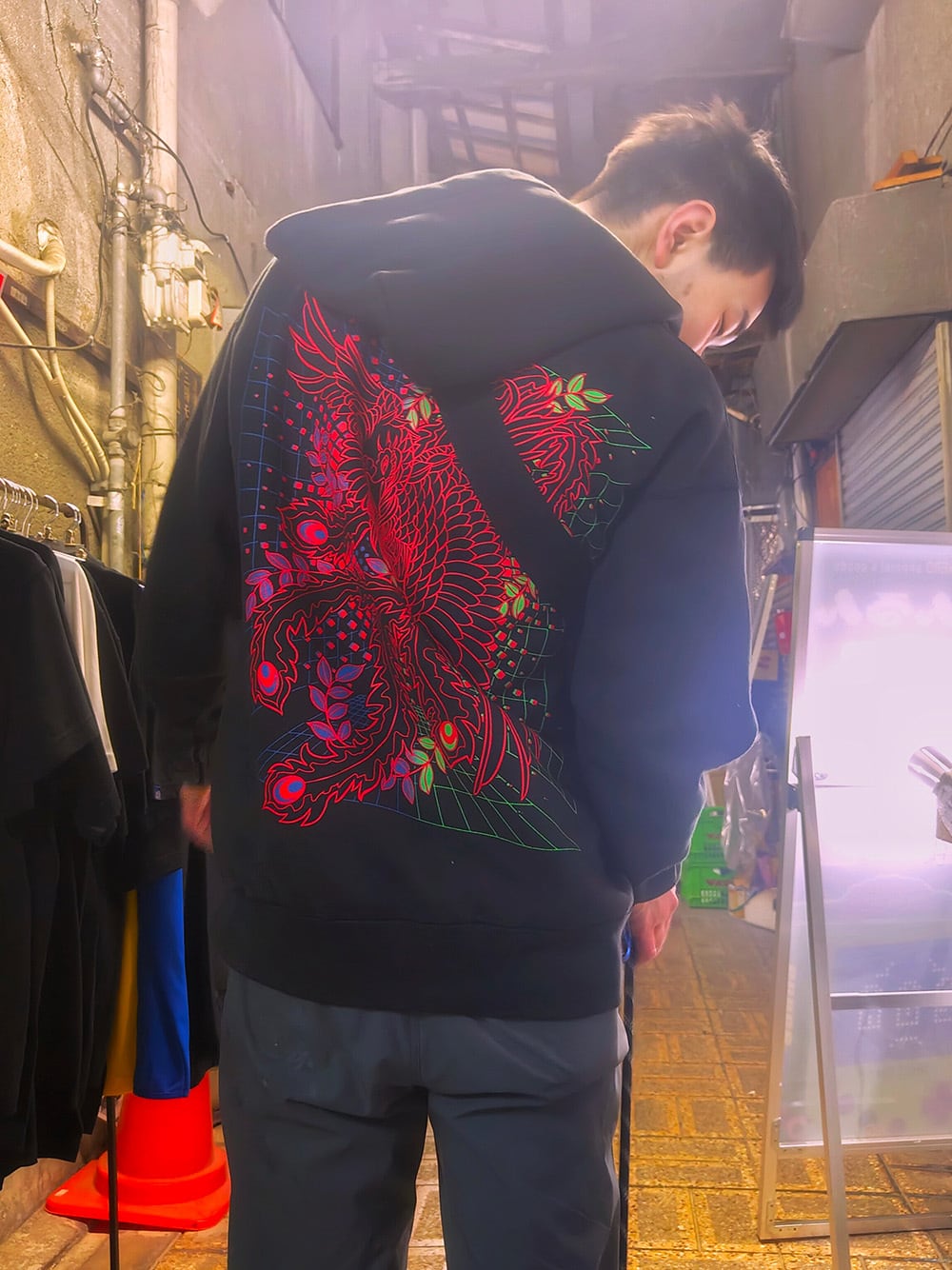 グリッド状の背景から飛び出す朱の羽と、イコライザーの躍動が交差する、和×サイバーパンクなパーカーです。