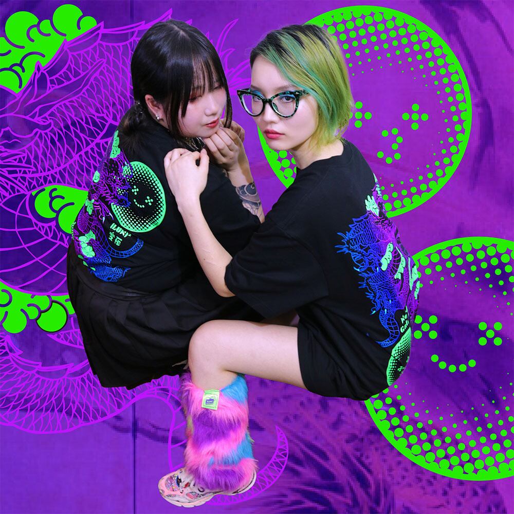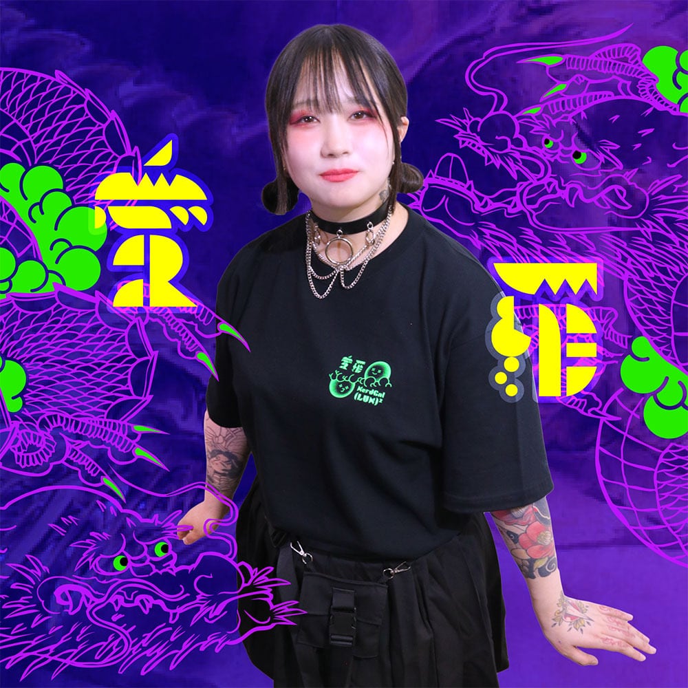 “青龍”のモチーフを、彫り師・愛羅が表情豊かに描き下ろし、るんるんがサイバーに仕上げました。手描きの“揺らぎ”とデジタルでしか描けない“正円”を組み合わせた、サイバー×刺青の融合グラフィックをTシャツに落とし込みました。