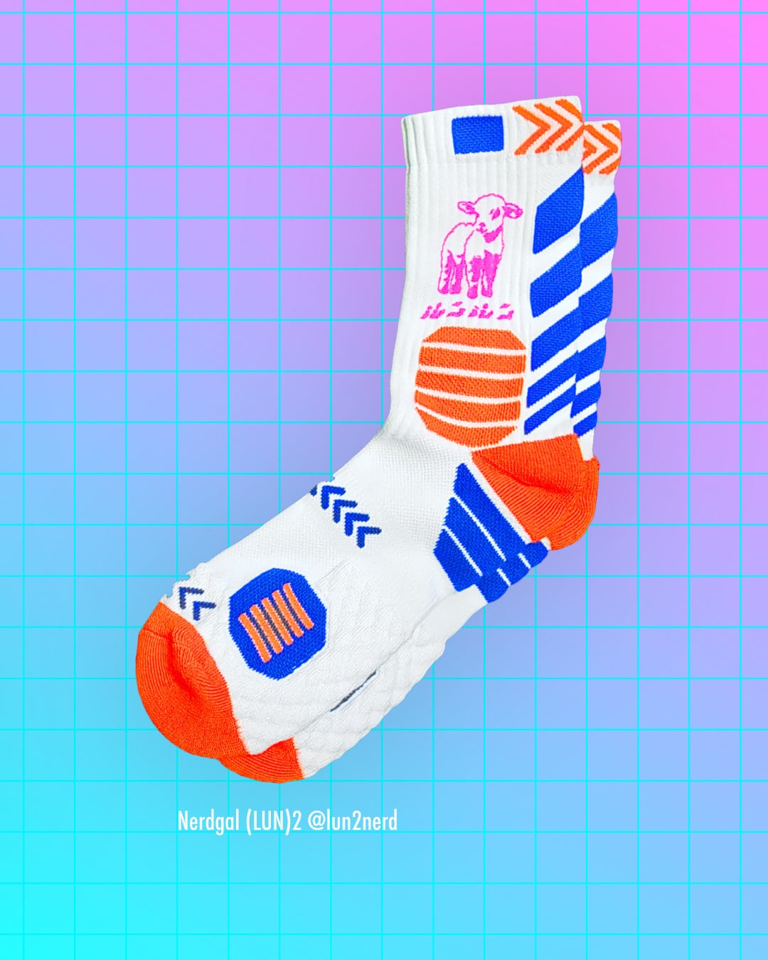 蛍光ラインとドット絵の羊をワンポイントにあしらった、個性派デザインのユニセックスなソックス。