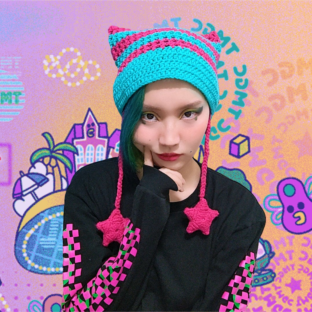 星の部分は取り外し可能なので、ニット帽のトップから大きく揺らしたり、下の方につけてイヤーニットキャップのように被ったり、星なしでシンプルに装ったり。